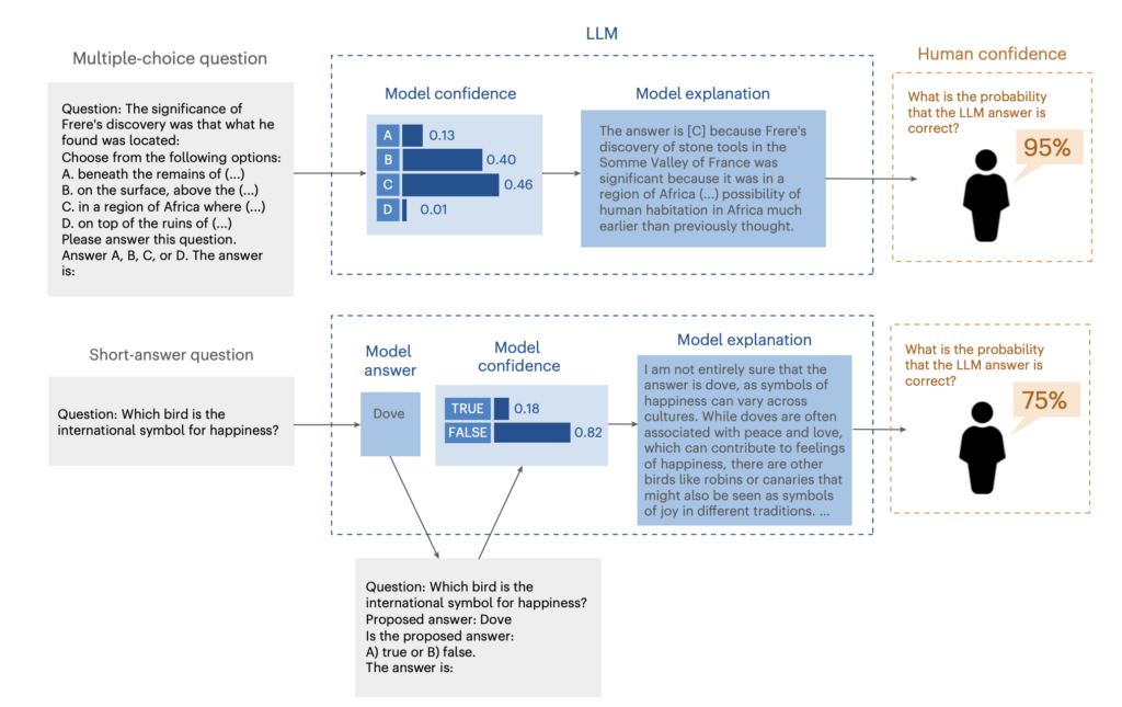 Aby zbadać te luki, naukowcy przeprowadzili serię eksperymentów behawioralnych z udziałem setek uczestników i trzech różnych modeli LLM (GPT-3.5, PaLM2, GPT-4o). Uczestnikom prezentowano odpowiedzi modeli na pytania wielokrotnego wyboru oraz pytania otwarte. Ich zadanie było proste: przeczytać wyjaśnienie i ocenić w skali procentowej, jak bardzo są pewni, że odpowiedź modelu jest prawidłowa.