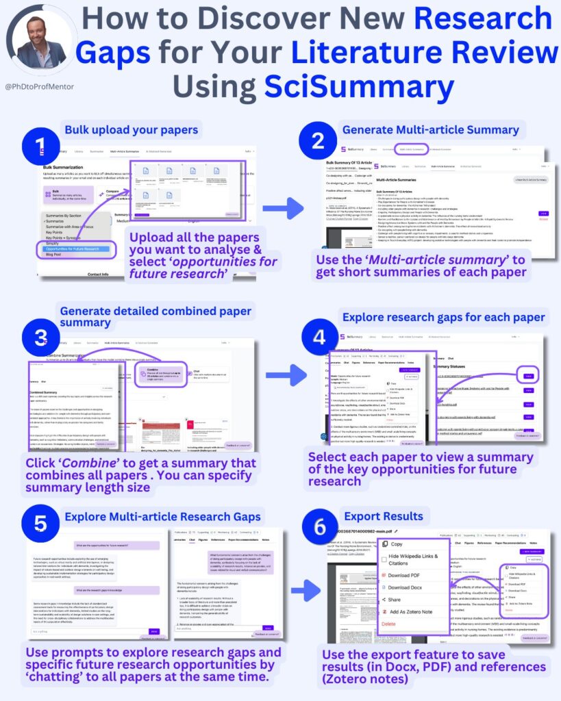 Poszukiwanie luk badawczych (research gaps) to kluczowy element każdej rozprawy doktorskiej. Często jednak bywa czasochłonne: trzeba przejrzeć dziesiątki (albo setki!) artykułów, przeanalizować konteksty i wyniki, a następnie zidentyfikować obszary, w których istnieje potrzeba dalszych badań. Narzędzie SciSummary może ten proces znacząco usprawnić, automatycznie wygenerować podsumowania wielu publikacji i wskazać potencjalne „opportunities for future research”. Poniżej opisuję krok po kroku, jak z niego skorzystać: