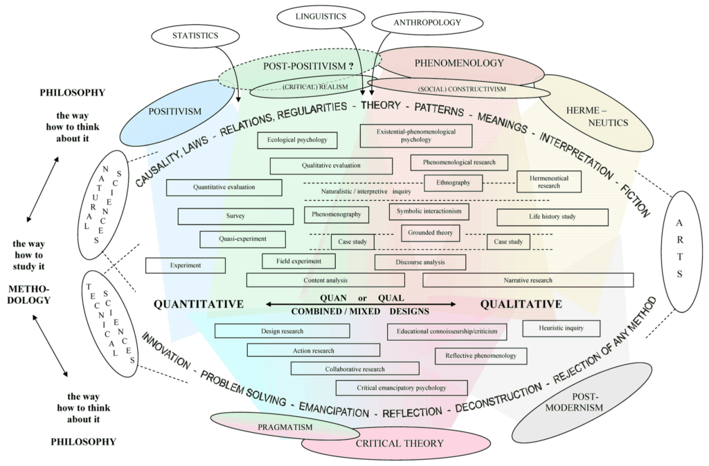 W świecie nauki istnieje wiele sposobów patrzenia na rzeczywistość i badania jej elementów – czasem tak różnych, że wydaje się, jakby należały do zupełnie odmiennych światów. Niektóre dziedziny naukowe opierają się na twardych danych liczbowych i eksperymentach, inne – na refleksji filozoficznej czy interpretacji znaczeń tworzonych przez ludzi. Zaprezentowany diagram (zawierający m.in. pozytywizm, postpozytywizm, fenomenologię, konstrukcjonizm społeczny, badania ilościowe, badania jakościowe i różne formy tzw. mixed methods) stanowi próbę usystematyzowania tych podejść.